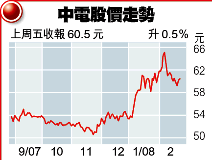 花旗預料,中電07年度全年純利約114.07億元,增幅15.22%。該行認為,中電具穩定收入來源,並估計可獲政府批准,於明年上半年在南丫島索罟灣興建天然氣儲存庫,屬利好消息,惟認為現價太貴。目前花旗給予中電「沽售」評級,目標價為57元。