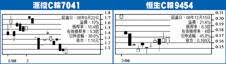 ■恒生C輪9454收0.169元,升0.002元,成交22.4球。此輪08年12月15日期滿,行使價152.88元,溢價21.6%,槓桿率8.3倍,有效4倍,引伸波幅45.8%,街貨1.6%。