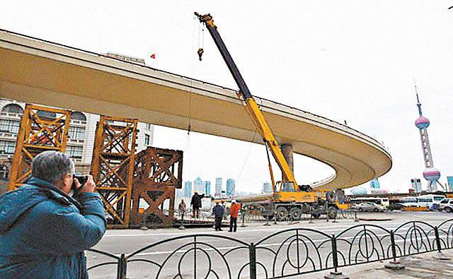 上海為迎接世博會、改善交通情況而進行的外灘交通大改造,在昨晨零時正式揭幕,包括亞洲第一彎在內的高架橋四條匝道(高架橋的進出口)和450米長高架主線,正式封閉,上海史上規模最大的高架橋拆除項目正式展開。早上9時,施工正式開始,工人用鎬頭機挖開路面,又將電纜拉出,準備拆除地面路燈。工人老吳說:「前晚那麼多人來看,其實兩年後,這裏肯定更漂亮!」