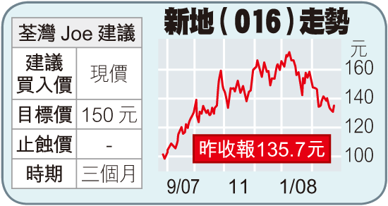 地產股扭轉連日跌勢,成為噚日升市動力之一,荃灣阿Joe認為新鴻基地產(016)調整已經完成,所以打嚟推介。連跌四日嘅新地噚日反彈4.1%,收報135.7蚊。