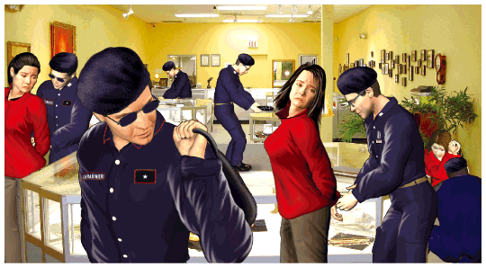 賊人大肆搜掠,將鑽石手鐲、耳環、頸飾和戒指掠走,但意猶未盡,再押着一名經理打開保險箱,將更珍貴的寶石劫走。他們得手後,在珠寶店外牆下一個洞潛回隔壁建築物,一名賊人更拋下一句:「這就是了,我們走吧!」最後成功逃之夭夭。