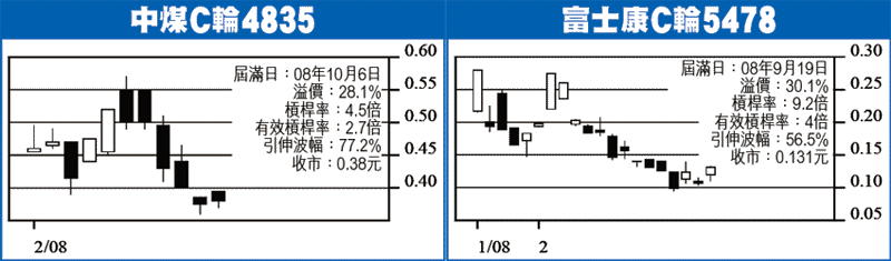 ■富士康C輪5478收0.131元,升0.024元,成交20.7球。此輪08年9月19日期滿,行使價14.28元,溢價30.1%,槓桿率9.2倍,有效4倍,引伸波幅56.5%,街貨4.9%。正股見13.50元,此輪理論價0.205元,升56%。
