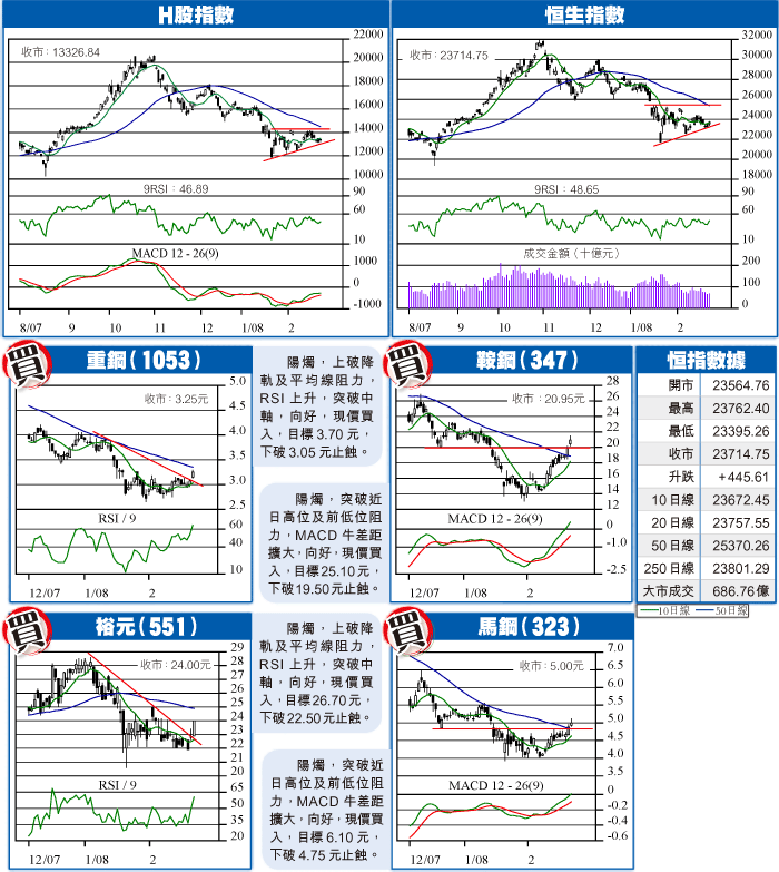 反彈阻力方面,恒指收在10日線(23672)之上,再往上看,有20日線(23757)及250日線(23801)交滙處,以及200日線(24758)阻力。