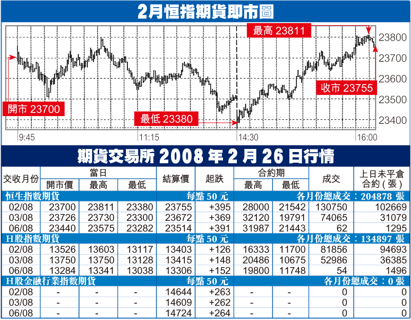 期指高開340點,作技術調整至23380後喘定,守於前日低位,於250日線附近拉鋸,報收23755,升395點,高水41點。