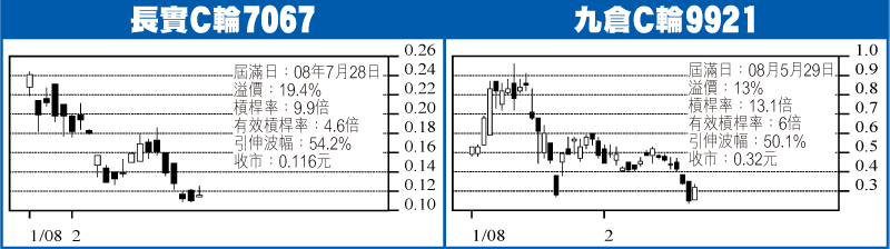 ■九倉C輪9921收0.32元,升0.072元,成交7.2球。此輪08年5月29日期滿,行使價42.308元,溢價13%,槓桿率13.1倍,有效6倍,引伸波幅50.1%,街貨11%。正股見43元,此輪轉回價內,理論價達0.476元,升49%。