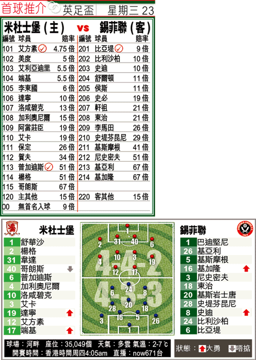 米杜士堡周三在英足盃第5圈重賽,主場對英冠錫菲聯;論實力主隊較強,加上經過之前一次交手後懂得如何對付錫菲聯,故有力在法定時間內取得8強最後一張入場券。(球賽編號:星期三23;now671台明日4:05am直播)吾中