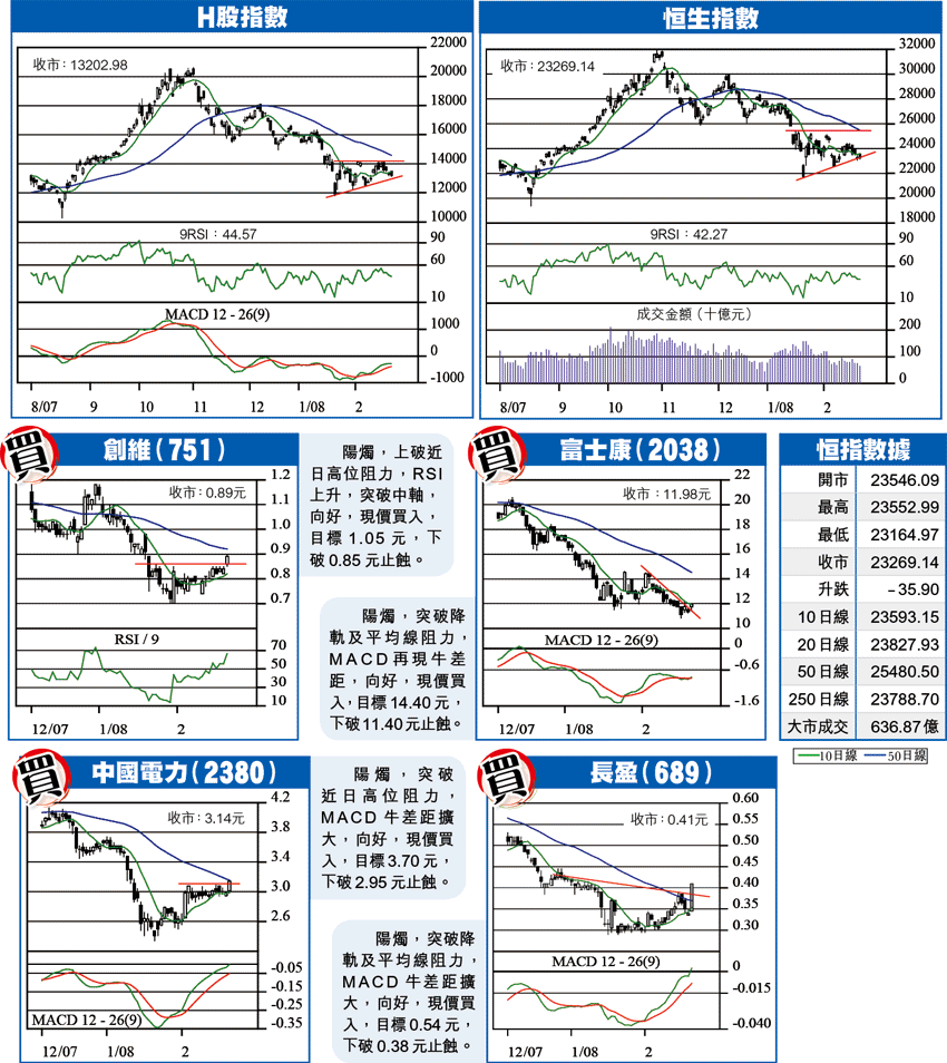 港股先升後跌,恒指裂口高開後無法擴大升幅,隨即回落,一度低見23164,有幸的是尾市回穩,跌幅收窄,收市報23269,跌35點,成交進一步減至636億元。現貨月期指收報23360,跌17點,高水擴大至91點,成交8萬多張。