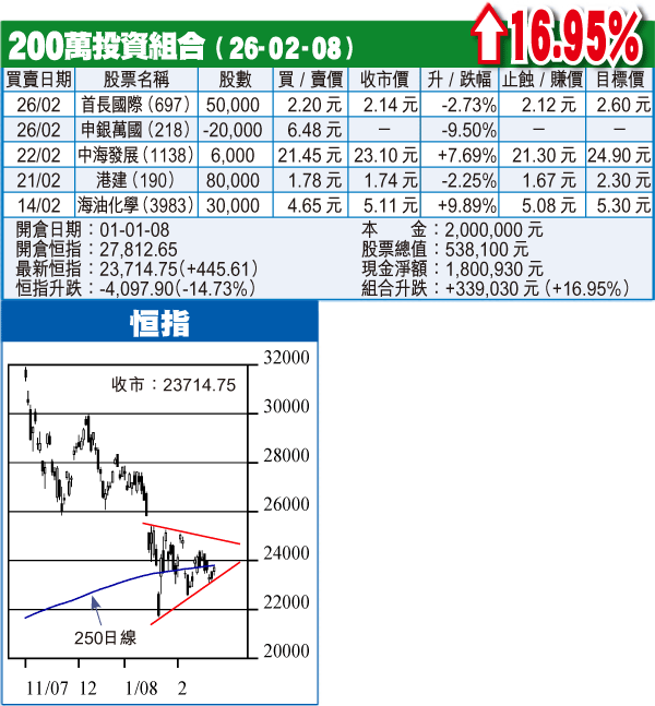 鋼鐵股昨日造好,首國(697)表現卻令人失望,但10日線已升破20日和250日線,仍可持有,止蝕位移至2.12元。申銀(218)已止蝕離場。海油化學(3983)再衝5.3元不果,今日再試關不破或跌穿5.08元將先行計數。