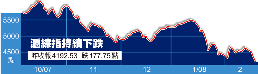 滬綜指昨最多跌4.29%,收4192.53點,跌177.75點或4.07%,4日累跌10.1%;深綜指最多跌3.76%,收1331.23,跌50.77點或3.67%。兩市A、B股總成交縮減至1362.56億元(人民幣.下同)。