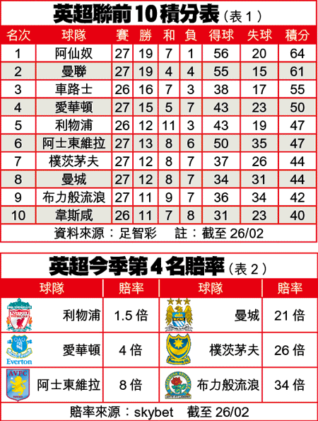 不過從英國博彩公司skybet開出賠率,較為看好愛華頓同市宿敵利物浦取得第4位;少打1場及少3分的利物浦,是1.5倍大熱門(見附表2),愛華頓為4倍次熱,阿士東維拉則有8倍,今仗輸波的曼城,更冷落至21倍。