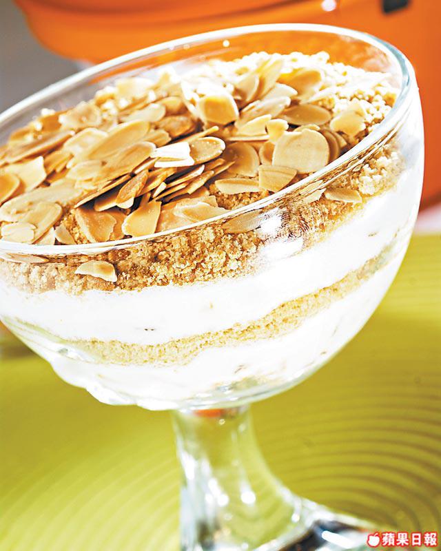 杏脯肉50克(切碎)、鮮忌廉100毫升、幼砂糖50克、呍呢拿香精/橙皮(切碎)各1/2茶匙、大蛋白1個、消化餅100克(壓碎)、杏仁片少許