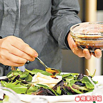 3.碟上放沙律菜,中間鋪上茄子,淋上醬汁便可。