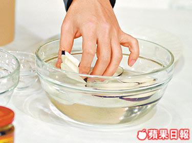 答:如非切後即煮,可以把茄子浸在一盆鹽水中,免其氧化。