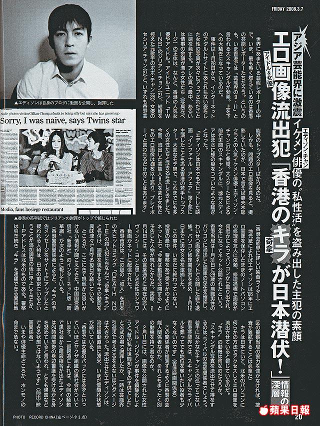 發生在香港的淫照風暴,現已向世界出發,陳冠希(Edison)上周舉行的記者會就吸引了不少外地傳媒採訪,繼日本雜誌《FLASH》後,《洛杉磯時報》前日也對事件作詳盡報道,明顯已變成國際話題。有網友就在討論區表示,遠在瑞士的《新蘇黎世報》(左圖)以「淫亂的娛樂事業」為題放在頭版大篇幅報道,更以疑似阿嬌的淫照作大相,該網友更貼出報紙相片供參考。另一方面,上周五在日本出版的《FRIDAY》(右圖)也有貼出數張淫照,向當地讀者詳述事件的來龍去脈。