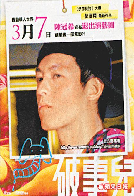 此外,彭浩翔執導、陳冠希有份演出的《破事兒》在台灣上映,廣告上竟然無端多了一個象鼻滴水的公仔,擺明影射淫照事件,更大字標題誇稱這是他退出前最後一部作品,但事實上Edison除了該片外,還有《神》片、《跳出去》及《蝙蝠俠—黑夜之神》(TheDarkKnight)尚未上映。