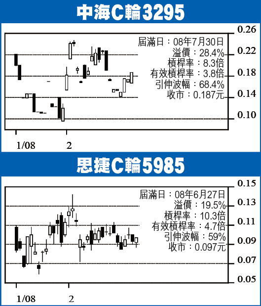 ■中海C輪3295收0.187元,升0.013元,成交8球。此輪08年7月30日到期,行使價18元,溢價28.4%,槓桿率8.3倍,有效3.8倍,引伸波幅68.4%,街貨低於0.1%。正股見17元,此輪理論價0.263元,升40%。