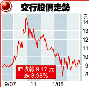 另一邊廂,美國次按危機觸發全球金融資產價格滑落,內地金融機構紛紛到海外尋找「獵物」。據傳媒引述消息透露,工行(1398)及建行(939)有意競投淡馬錫旗下持有的印尼第6大銀行PTBankInternasionalIndonesia股權,涉資或達10億美元以上。而蔣超良亦不諱言,該行風險管理水平已大幅提升,美、英、日、韓等地監管機構均對交行有認識,這有利交行海外收購。目前交行已與一些潛在目標進行接觸。