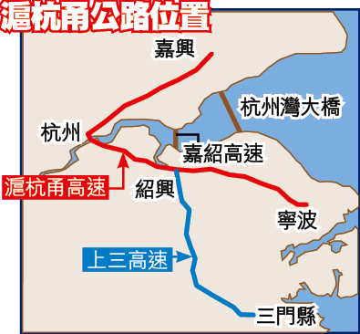 姜文耀再派定心丸指,兩年多前提出在杭州灣大橋附近增建的嘉紹高速,去年底終獲上馬,料今年底可動工,最快2011年底前建成。嘉紹總投資額約110億元,當中70%以工程融資支付。因滬杭甬佔股35%,攤佔現金額約10億元。