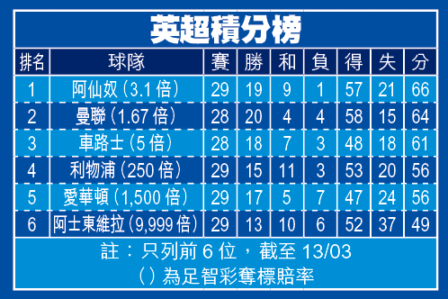 僅落後阿仙奴5分