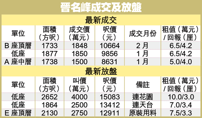 火炭晉名峰由高座及低座組成,低座為數16伙全屬特色戶,包括複式、連天台或連花園4房戶;另有9個特色單位分佈於高座頂層,面積1378至3092方呎,各戶均附連平台和天台。現時高座特色戶只有兩個放盤,其一連100萬元裝修,叫價較高。