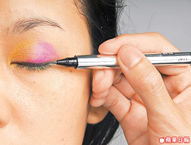 1. 先用黑色Liquid狀眼線筆,貼着眼線畫上幼幼的上眼線。