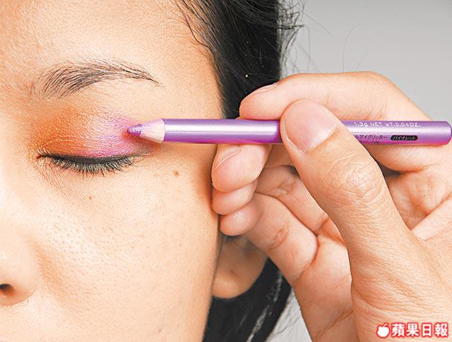 2. 用紫色眼線筆塗在整個眼窩位,造出眼影的效果。