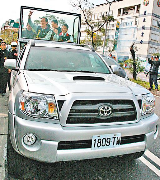 馬英九自行添購的防彈車(圖)昨日在宜蘭亮相,該車由日本TOYOTA廂式小貨車改裝而成,淺灰色,保安性能與台灣安全部門提供的防彈車相同,唯一不同是,該車底座較官車矮10公分,以方便馬英九與車外民眾握手,不致扭傷腰。該車耗資170萬新台幣(約43萬港幣),完全由馬自掏荷包,安全性毫不含糊,滅火器、防彈盾牌及加厚防彈玻璃,全都照安全規格加裝,甚至扶手還多加防滑設計,讓馬掃街拉票時更方便安心。