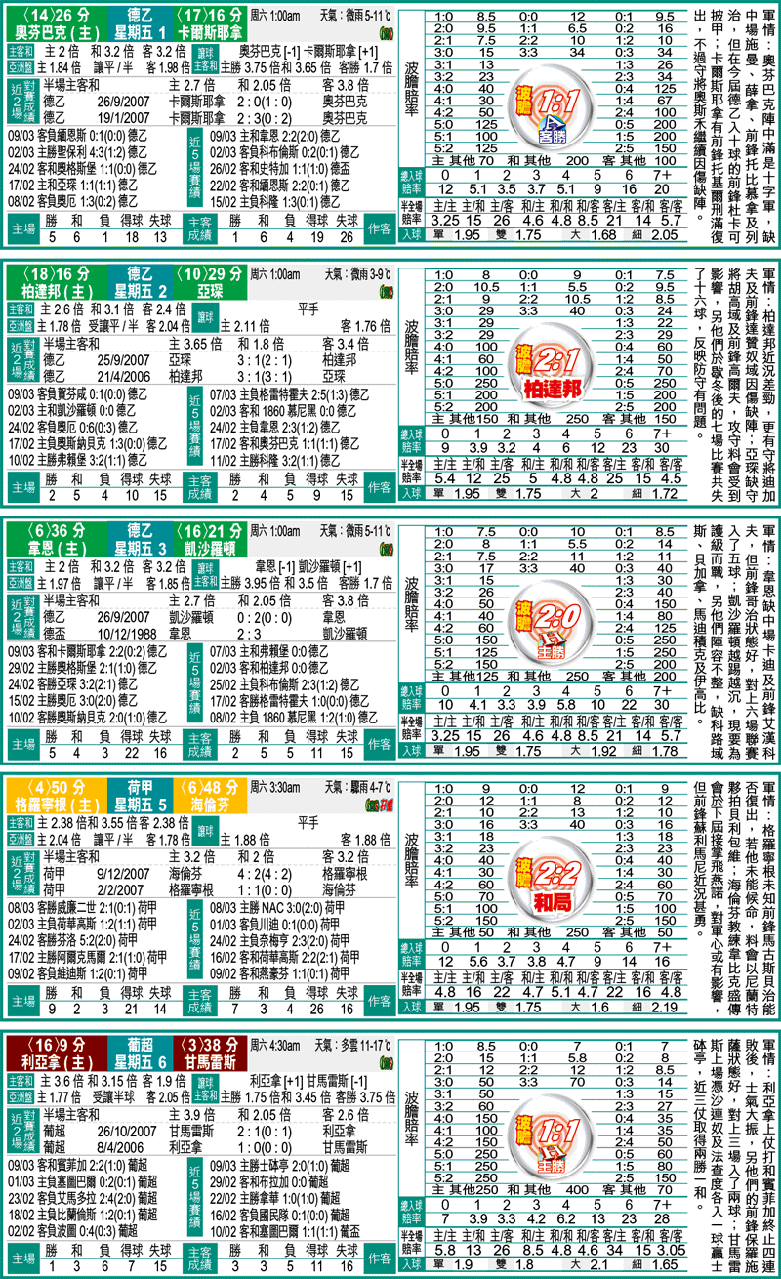 至於葡超利亞拿迎甘馬雷斯一仗,甘馬雷斯近3仗取得2勝1和,其中上仗更憑沙連奴及法查度各入一球贏士砵亭,但主隊上仗打和賓菲加終止4連敗後,士氣大振,加上前鋒保羅施薩狀態好,近3場入了2球,一於吼實[+1]的「主勝」。文:青蛙仔