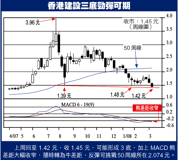 1)底部翻騰,股民折騰。冷靜面對,趁低吸入,揀啱對象,就有短炒獲利機會。香港建設(190)經連串擴展動作,有助股價逆流而上,今周有得諗。