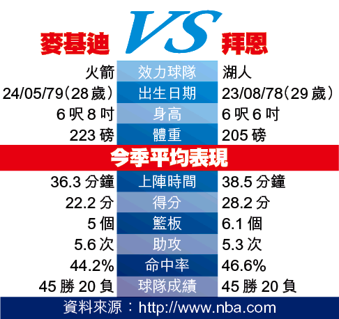 周日火箭將於主場迎戰湖人,可說是不折不扣的西岸「1哥」之爭,也是火箭在連勝征途上面臨最嚴峻的挑戰。兩隊的勝負關鍵將落到T-Mac與拜恩身上,前者在姚明缺陣至今的9戰中,平均獨得近26分;而拜恩則平均攻入逾28分。