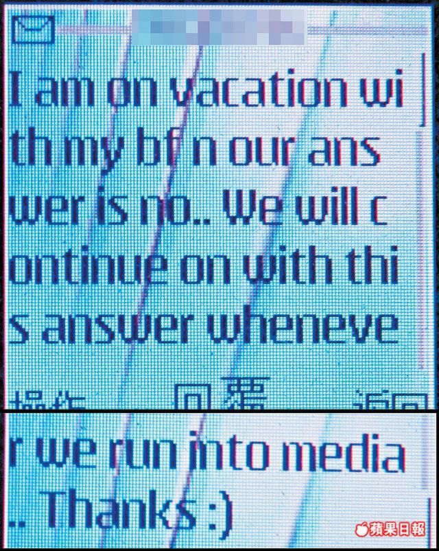記者前日多次致電樂基兒手提電話,均轉駁到留言信箱,之後記者以短訊向她求證婚訊,昨日凌晨樂基兒終以SMS回覆,親自否認與黎明結婚的傳聞,更表示她月內便會復工,她在短訊內表示:「Nosuchthing.Amonvacation..Willbeintaiwannextweekforwork..Sortthingsout.Butthanksanyway.Takecare(沒有這樣的事,我正在放假,下星期會在台灣工作,處理一些事情,不過無論如何,多謝關心,保重。)」。由於有報道指黎明曾親口承認婚訊,記者昨日再次向樂基兒求證,她於昨晚約9時再以SMS回覆,指她與黎明的答案都是「No」,SMS內容意譯如下:「我現正與男友度假,我們的答案是沒有結婚……無論傳媒怎樣問我們,我們的答案都是一樣。謝謝。」