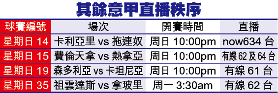 至於另一場由卡利亞里對拖連奴的直播,戰況難料,個人傾向和波,但信心度一般,不列入今次過關推介之內。