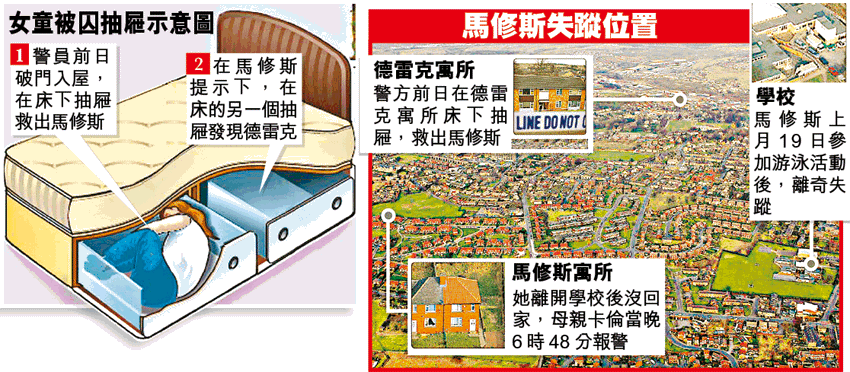 警員覺得十分可疑,立即報告上級增援。到了下午約12時半,警方破開德雷克住所大門,入內搜索,在一張床下面的抽屜,發現馬修斯。警員擁抱安慰她,並輕聲問她:「那個男人在那裏?」馬修斯用手指着床,警員隨即在床下另一個抽屜,發現39歲的德雷克,當場拘捕他。