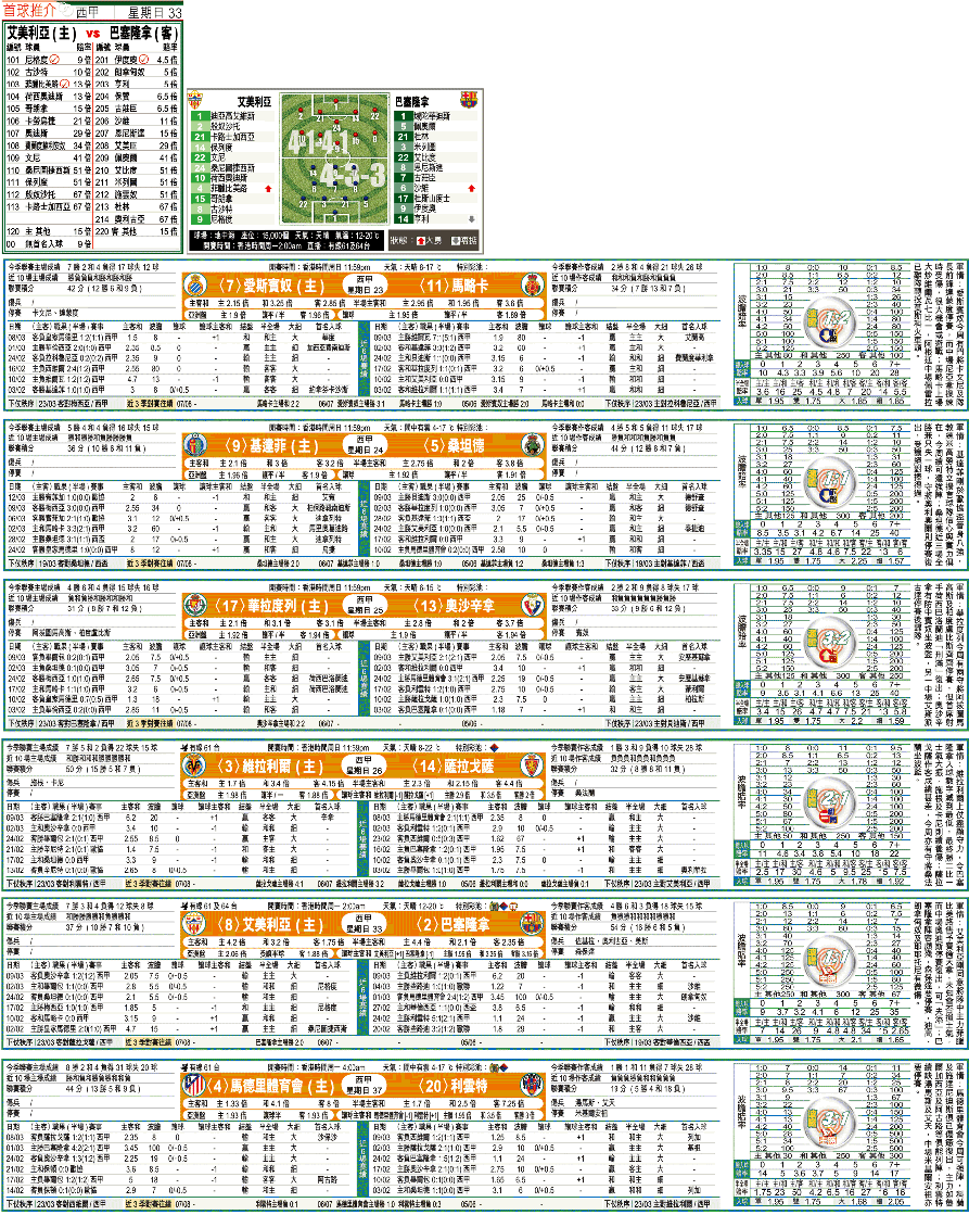 巴塞近兩場聯賽連敗,作客2:4負馬德里體育會防線漏洞甚多,戰敗實屬正常;上場則憑魯營威力創造甚多埋門機會,但仍受制於維拉利爾出色的防守,最終以1:2見負,反映這班波近期走勢確欠順。信艾美利亞的守力能主場賽和巴塞,一試1.95倍「主勝」。