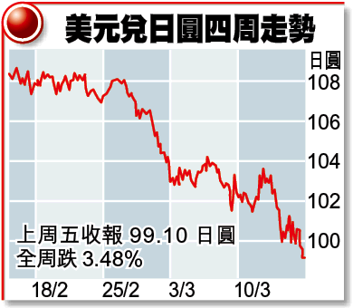 美元上周五曾跌到98.91日圓,是95年9月以來最弱,收報99.10,是12年來首次收低於100日圓大關;全周累計大跌3.48%,連挫4周,其間累積跌去8.1%。歐元兌美元上周勁升2.07%,收報1.5674,是連續第5周高收,為去年11月以來最長升浪。至於反映美元兌一籃子貨幣的美滙指數,上周五曾降到71.578的歷史新低,收報71.657;全周挫1.88%,連跌5周。