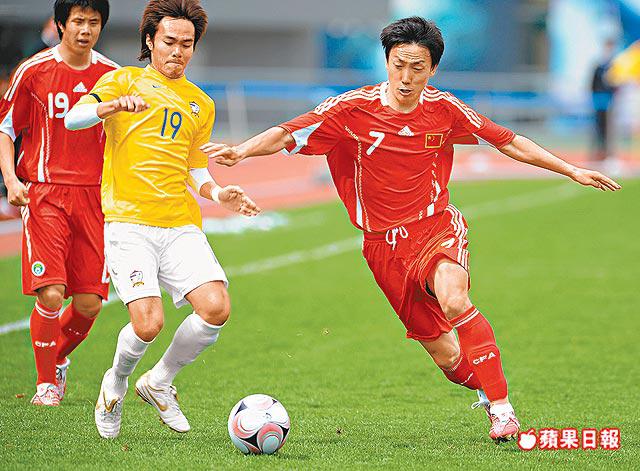 在昆明舉行的友賽,中國僅憑曲波(右)、韓鵬和朱挺各建一功,迫和泰國三比三;中堅李瑋峰曾在下半場十二碼宴客。新華社