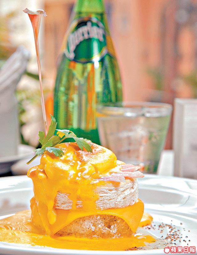 傳統美式早餐,把呈溏心狀的poachedegg切開後,蛋汁滲入夾着火腿、芝士的烤麵包內,蘸酸酸甜甜的荷蘭汁同吃,滋味無窮。(星期六、日及公眾假brunch中供應)