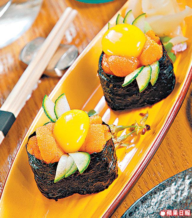 海膽軍艦加入鵪鶉蛋黃,生色不少;且鵪鶉蛋較雞蛋香,能提升海膽鮮度。