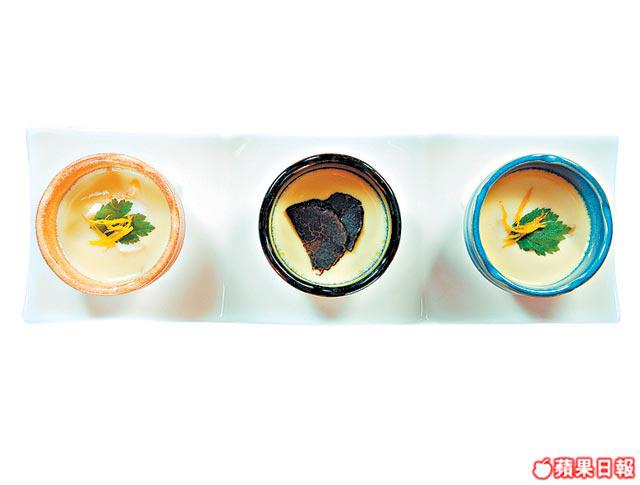 傳統日式蒸蛋中加入木魚水、味醂及糖,充滿魚鮮香味。三個小碗分別放入龍蝦肉、黑松露及魚翅,各具滋味。