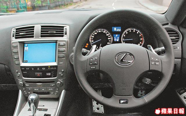 論馬力,ISF已勝過寶馬M3、拍住AudiR8、直逼日產GT-R,但同歐洲人鬥豪華亦唔輸蝕;全車皮製內櫳、仿桶椅及軚環,屬頂級豪華,中控台跟IS車系250、350相近的簡約高貴,唔會幾百個掣睇見都煩;輕觸式屏幕功能多多,一眼睇晒前後泊車情況。咪以為水貨車日文介面好難用,試一陣已對各類功能有所掌握,跟車師傅仲話只要改少少嘢,連電視同GPS都收到。