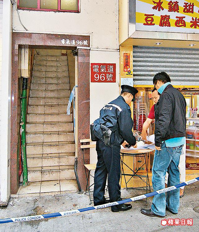 20多名「O記」探員昨午聯同鑑證科人員和機動部隊警員,重返電氣道96號的兇案現場調查,警員向附近一帶的食肆、店舖和街坊進行問卷,詢問他們在周日下午3時至7時左右是否送過外賣往上址單位,以及是否見到一名年約40餘歲、打扮似商人的男子出入案發單位。