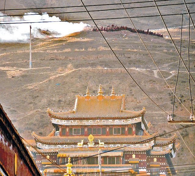 同仁縣藏僧前日走上寺院後山,放爆竹表達不滿。美聯社