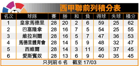 目前皇馬以62分續排榜首,巴塞則已落後7分列次席;考慮到皇馬已在所有盃賽出局,而巴塞尚有歐聯及西盃(周四4強次回合作客華倫西亞)戰線,難怪足智彩即時將皇馬奪標賠率轉熱至1.15倍,巴塞回冷至5.5倍。賽後巴塞教練列卡特說:「能在客場取得兩個入球本應很理想,最終仍未能全取3分,我對此感到羞恥,希望球員不要失掉爭標信心。」