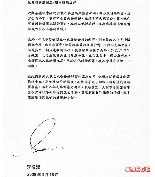梁洛施最近被傳與首富李嘉誠次子李澤楷相戀,有指她為了愛情決意與經理人公司英皇提前解約,但雙方談不攏解約事,梁實行玩失蹤。連日來不斷有關於她的負面報道,日前英皇發出聲明又提及她,昨晚她終於首度發聲明,指自己於去年7月後已沒有住在李澤楷公司旗下物業貝沙灣。