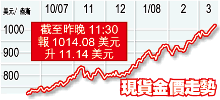 環球信貸危機令市場對美元信心幾乎崩潰,股滙前景未許樂觀,專家認為,美元持續下滑,令商品市場成為資金避風港,當中避險最佳的首選黃金,其次是石油。國際現貨金價昨最多飆2.97%至每盎斯1032.7美元,再創新高;紐約4月期金更一度升3.44%,至每盎斯1033.9美元。紐約期油則最多漲1.44%,報每桶111.8美元。