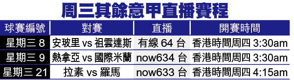 榜首的國際米蘭就作客熱拿亞,雖有馬特拉斯停賽,但兵源始終是其優勢,加上去仗只能小勝巴勒莫,今番絕對有力開「客勝」益街坊;祖雲達斯陣內老將不少,周中賽事對他們無疑是一大考驗,而4連負的安玻里,有射手沙達廸坐波監,幾乎無鋒可用,賽前更揚言會死守博1分,故吼「細」不錯。另有一場私人心水,利禾奴主場面對去仗無故大勝的里賈納,上盤實食!文:阿呢斯奧