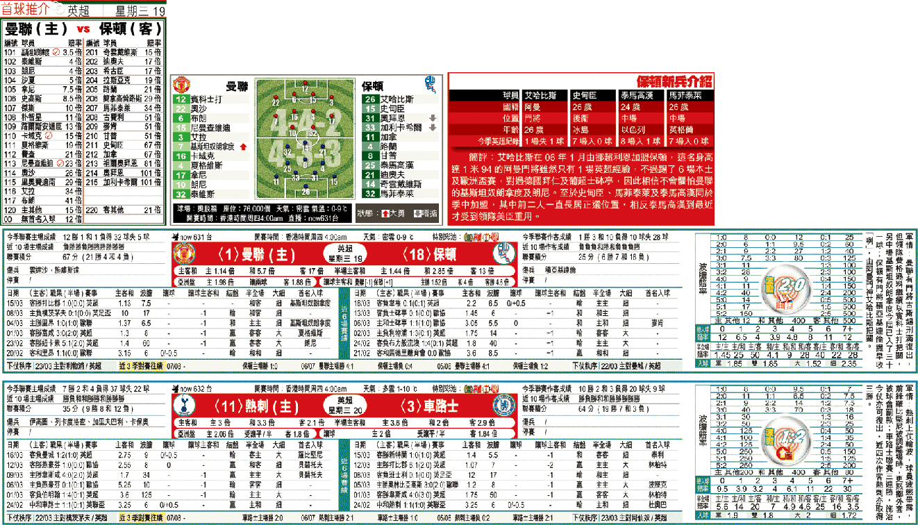 曼聯要是在周三英超聯擊退弱隊保頓,與阿仙奴的位置便由平起平坐變成有3分領先優勢,相信他們不會讓機會溜走,就捧「讓球主客和」曼聯[-1]「主勝」。