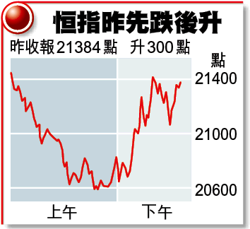 【本報訊】港股三日累挫2338點後,昨日驚濤駭浪止跌回升,重演久違的V形反彈。恒指高開360點,受累基金清倉活動及A股頹勢,指數午市前曾倒跌511點。午後3時重磅股低位獲資金追捧,令市況再度逆轉,埋單升300點或1.42%,報21384點。H股指數亦收復中段急跌5.3%失地,收報11074點,升37點或0.34%。