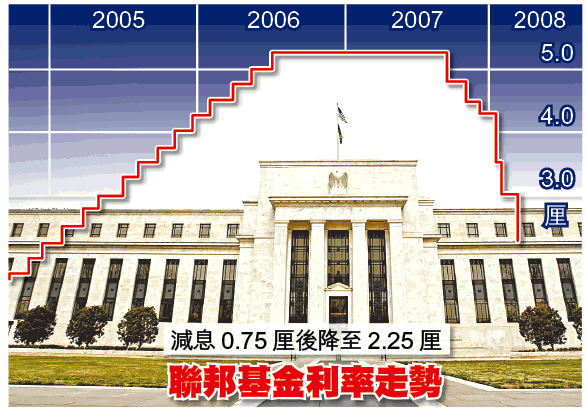 為支持美國疲弱的經濟,並恢復市場對金融體系的信心,聯儲局周二宣佈調低聯邦基金目標利率0.75厘,至2.25厘,是05年2月以來最低水平。當局並調低貼現率0.75厘,至2.5厘。