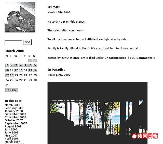 鍾欣桐因淫照風暴被迫「人間蒸發」,日前有消息指她曾與蔡卓妍到泰國拜會白龍王問津,之後她才會合緋聞男友麥浚龍到泰國一個小島度假,據悉二人前晚已返抵香港。其實阿嬌和Juno由傳緋聞之初至被揭出埠旅行,都可從男方經常更新的網誌上露端倪,難怪阿Sa昨提Juno寫blog已沉不住氣,對他頗具微言。